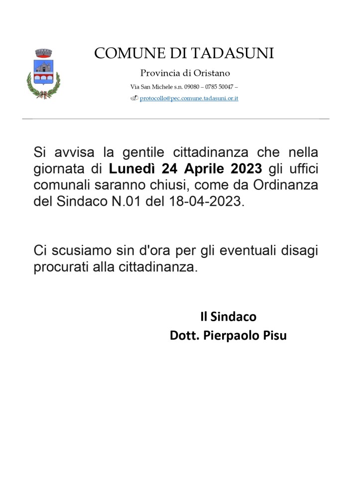 CHIUSURA UFFICI COMUNALI LUNEDI' 24 APRILE 2023